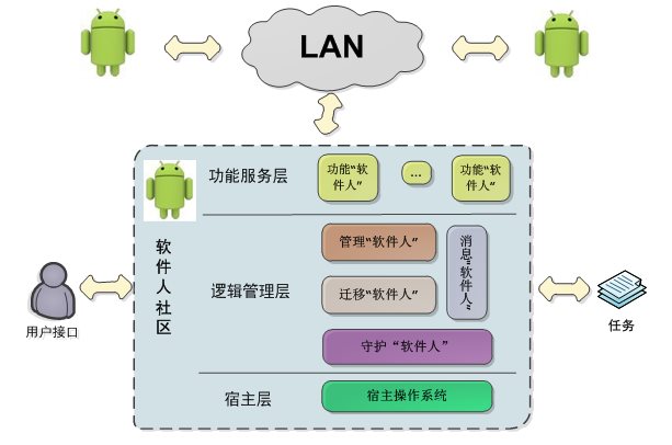 分布式“软件人”系统软件,以Linux系统为底层平台,通过守护“软件人”的构造,将原有节点上以进程为基本单位的Linux系统转化为以“软件人”为资源分配和管理的“软件人”系统。节点上的“软件人”系统采用了以管理“软件人”为控制中心,以消息“软件人”为分布通信中枢,以迁移“软件人”为“软件人”移动通道的管理系统。