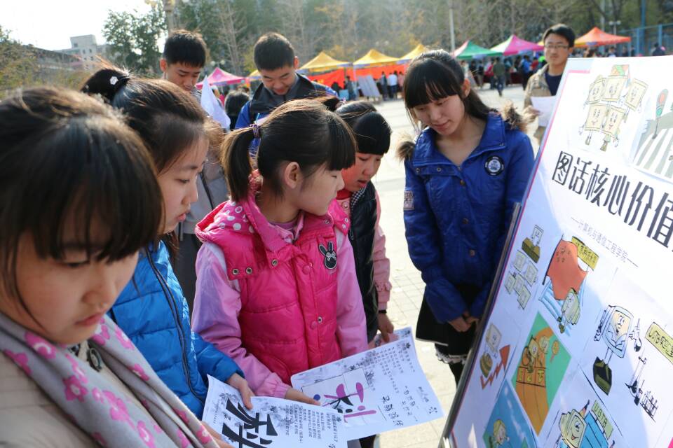 第二届科技游园会上,一个可爱的电脑人卡通形象很受欢迎,“为电脑人正能量点赞”,“看卡通人行为猜价值观准则”等活动引导了路过师生的关注和参与。这个电脑人是学院学生党员发挥专业所学,将信息技术运用至党建工作中的成果之一。今年10月,由学生党员组建团队,设计出名为“一点”的计通电脑人卡通人形象,一经推出就抓住了学院师生的眼球。以电脑人为主人公描绘的“‘一点计通’,图话社会主义核心价值观”的主题漫画在微信朋友圈和QQ空间里也受到了师生们积极关注和热情转发。