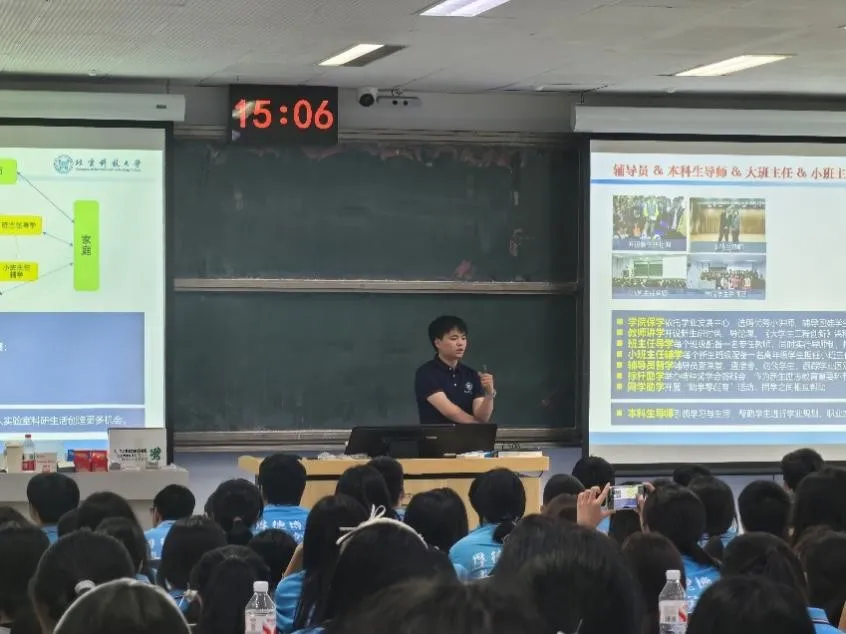 随后,辅导员胡晗明展开了细致全面的介绍。他从学校与学院的历史沿革讲起,清晰阐释了辅导员、大班主任及小班主任的职责定位,深入解读了本科生导师制的具体内容与重要意义,同时对新生入学各项注意事项、军训相关须知等实用信息逐一说明。深入浅出的讲解让同学们对校园环境、学习资源、生活安排及未来成长路径有了全面且清晰的认识,不仅为大家快速适应大学生活提供了指引,更引导同学们理解并认同学校的文化传统与精神内核,逐步厚植爱校荣校的归属感与使命感。