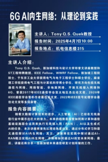 主讲人介绍:Tony Q.S.Quek,新加坡科技与设计大学郑曾文讲座教授和ST工程特聘教授,IEEE Fellow,WWRF Fellow,新加坡工程院院士,于东京工业大学获得电气与电子工程学士和硕士学位,麻省理工学院获得电气工程与计算机科学博士学位。研究方向包括无线通信与网络、网络智能、非地面网络、开放无线接入网络和6G。曾获2017年IEEE通信学会亚太地区杰出论文奖、2020年IEEE通信学会青年作者最佳论文奖、2022年IEEE信号处理学会最佳论文奖等多项荣誓。