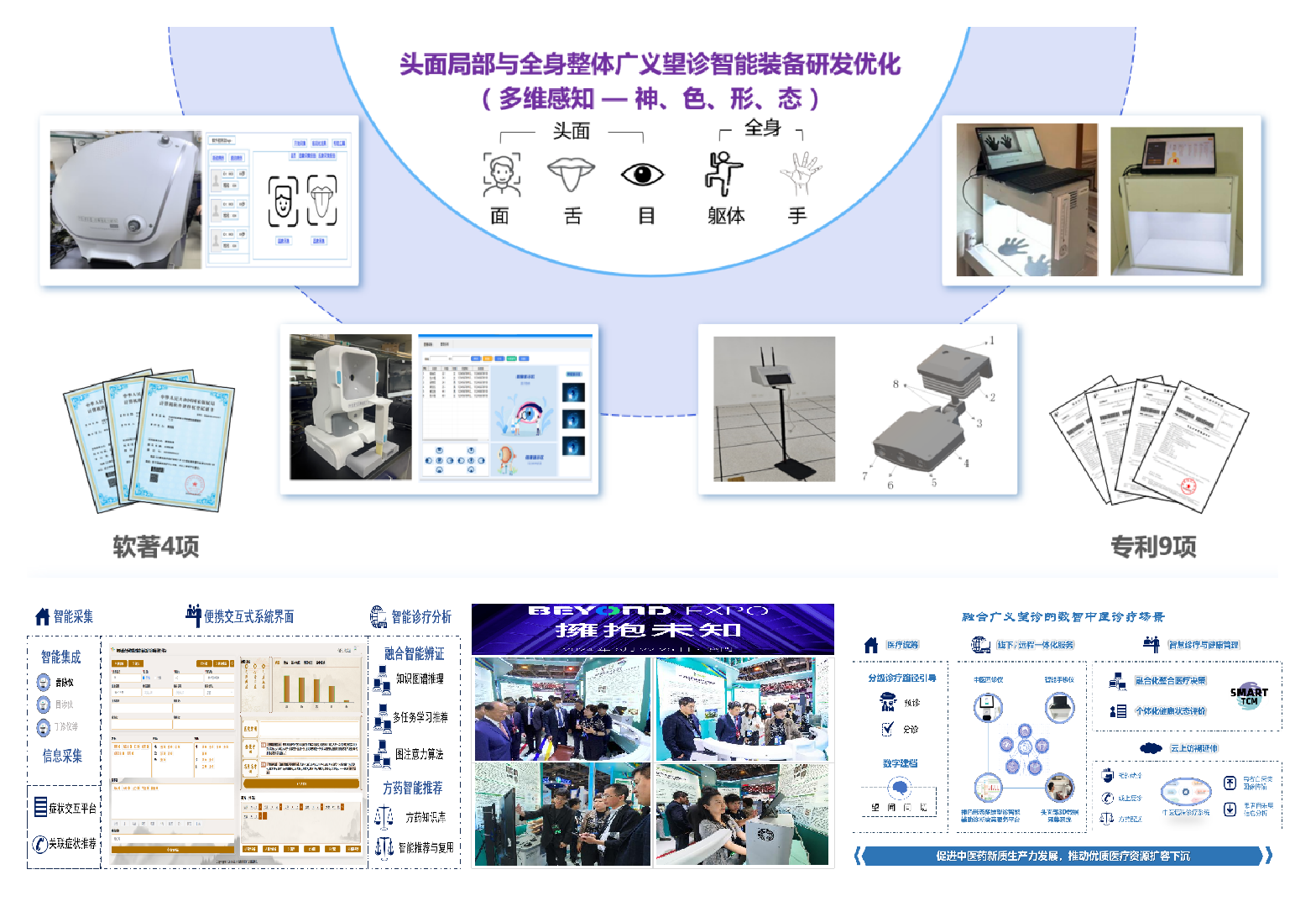 基于系统科学及中医象思维原创理论,提出从平面到立体、静态到动态、片段到时序、局部整体互参、中西交叉融通的广义望诊,形成数智中医广义望诊装备及多维感知、融合分析及评价决策技术体系。研发了系列装备及平台,可实现对舌、面、目、手、身形、体态、步态、异常动作、微表情等体表征象的多维度、全方位捕捉与融合分析,适用于医疗机构、体检/康养中心、居家不同场景,为疾病大规模筛查,健康体检或监测提供无创简便快捷的方案。并建立了相关数据标准、质控方法、服务方案。申请专利9项、软著4项,制订团体标准1项。为重大慢病的健康监护及基层诊疗提供了有力支撑。成果参展了第四届BEYOND Expo国际科技创新博览会,得到澳门特首及投资者的高度关注。