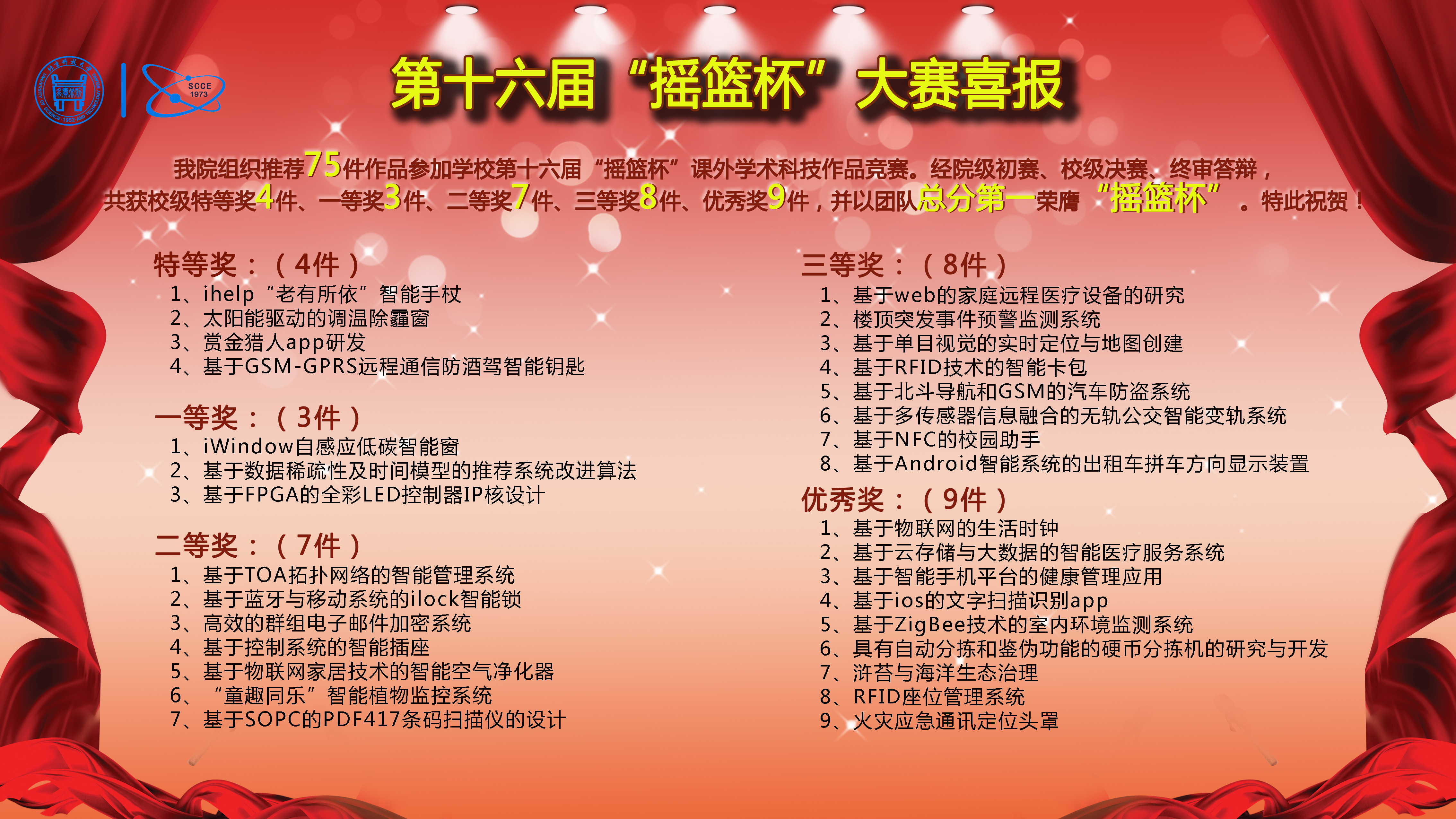 近日,成人漫画 第十六届 “摇篮杯”大学生课外学术科技作品竞赛落幕,成人漫画 取得优异成绩,以团队总分第一荣膺“摇篮杯”。学院共组织推荐75件作品参加此次竞赛,经过院级初审、校级决赛、终审答辩等环节,最终获校级特等奖4件,一等奖3件,二等奖7件,三等奖8件,优秀奖9件。