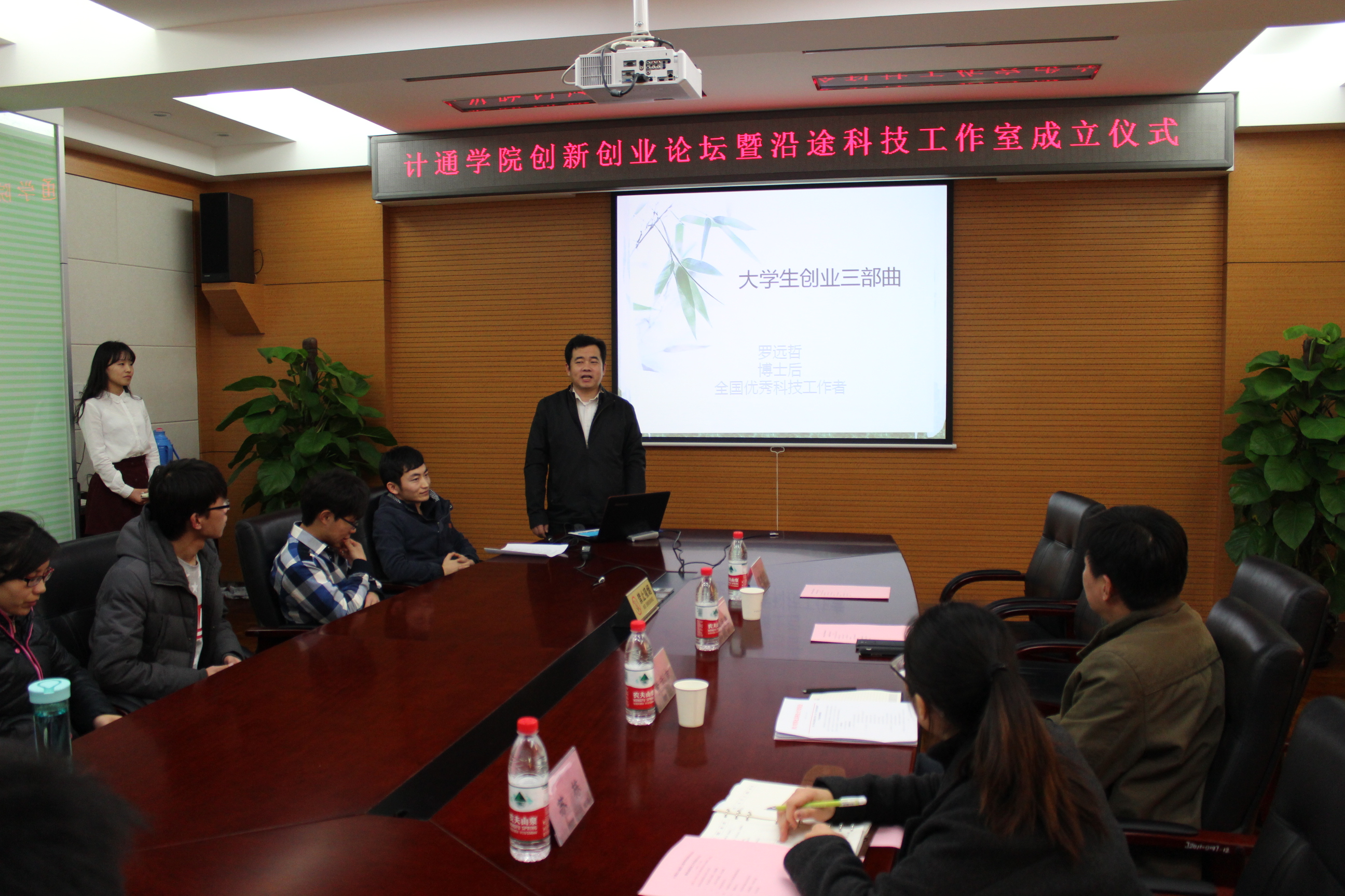 在最后的总结讲话中,黄武南结合自己的参与感受,向在场的同学们提出了两点希望和要求。首先是要充分认识到在当前信息化大背景下大学生创新创业的重要性和必然性。他指出,创业是时代的特征,也是我们信息相关学科的属性。当前,与信息学科相关的产业已占到一半以上,推进协同创新,也要用信息化推动各行各业的创新发展,因此,无论是从战略还是战术的层次上,都要高度重视创新创业工作。其次要认识到创新创业对于大学生成长成才的重要意义。创业是青年的责任和担当,调查结果显示,创业精英的黄金创业年龄在29岁左右,而在中关村也有所谓的创业“21岁现象”,可见,创业是青年人的事业,广大青年学生应大胆尝试,勇于开拓,闯出一片属于自己的天空。最后,黄书记强调,沿途科技工作室应作为一面旗帜,在实现自身创业目标的同时,努力将学院乃至学校的创新创业工作推向一个新的高度,学院也会尽可能地为沿途科技工作室的发展提供支持和帮助,积极鼓励学院学子在创新创业方面的探索和尝试。