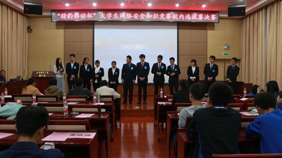 首先由主持人宣布‘“猎豹移动杯”大学生网络安全知识竞赛校内选拔赛决赛’正式开始。在一片掌声中,王昭顺进行了开场致辞,阐述了在计算机网络越来越发达的今天,网络安全的重要性,同时也为比赛的开场加温。在观众的期待中,选手们正式进入了比赛环节。