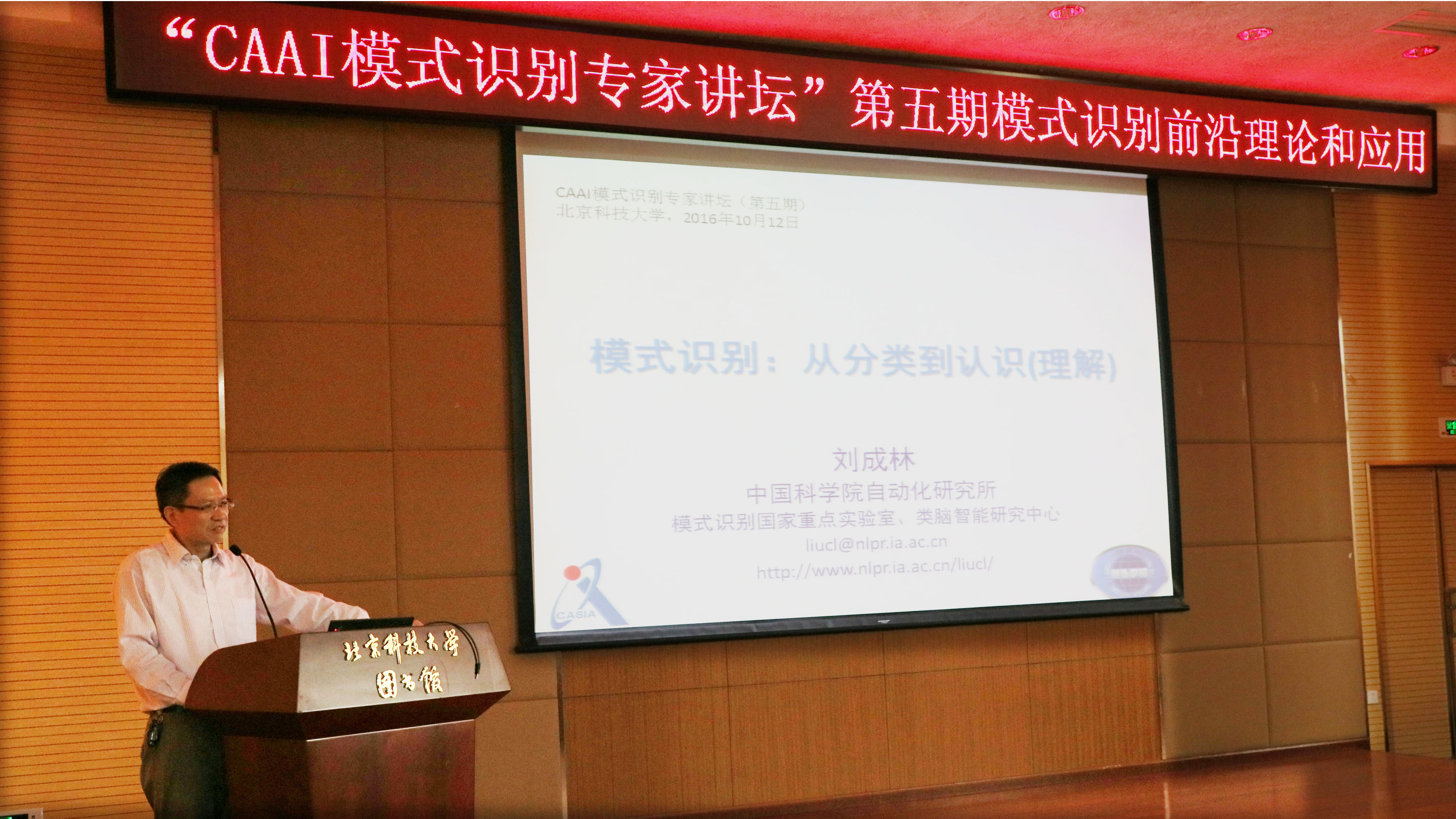 第一位讲者为刘成林教授,中国科学院自动化研究所副所长,模式识别国家重点实验室主任,中国人工智能学会模式识别专业委员会主任,国家杰出青年科学基金获得者,美国电气电子工程师协会会士 (IEEE Fellow)、国际模式识别学会会士 (IAPR Fellow)。刘成林的报告题目是《模式识别:从分类到认识》,报告简要回顾了模式识别的主要方法并分析其特点,随后从模式分类上升到对模式的理解,从鲁棒性的角度指出模式理解的重要性。刘教授结合当前的研究现状和趋势,总结了几种面向模式理解的研究途径、模式识别模型和方法,并给出了具体的研究例子或设想。