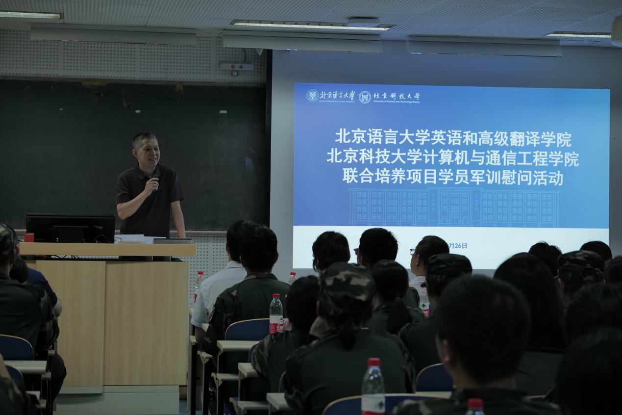 随后,皇甫伟上台讲话。他首先对北语同仁的到来表示热烈欢迎,并向军训中的同学们致以亲切问候。谈及两校的联合培养项目,皇甫伟指出,在全球科技革命与产业变革深入推进的背景下,“技术 + 人文”的复合型人才成为国家急需力量,两校强强联合,将“代码的逻辑”与“语言的温度”融合,为同学们铺就“宽口径、高适配”的成长之路。他详细介绍了项目的课程设置与培养目标,强调将让同学们既练就“硬核”技术本领,又具备“柔性”跨文化沟通能力。同时,他将军训解读为同学们“复合成长”的第一步,他指出,站军姿练的是“熬得住”的韧劲,齐步走练的是“懂配合”的意识,烈日下坚持练的是“有担当”的品格,这些都将成为未来学习与工作的重要财富。
