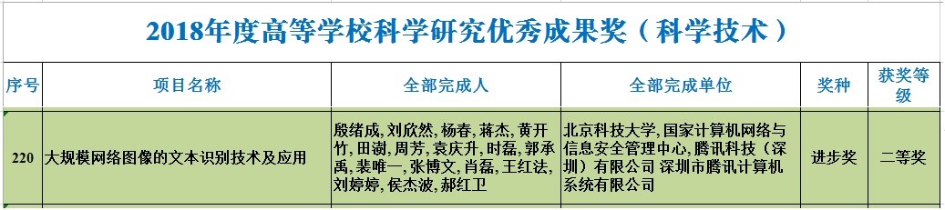 1.北京市科技进步三等奖1项(2017年度) 由成人漫画 阳小龙教授团队牵头申报的《面向异构通信环境的云计算资源管理关键技术及IaaS系统应用》成果,获2017年度北京市科技进步三等奖(牵头单位)。2.青海省科技进步二...